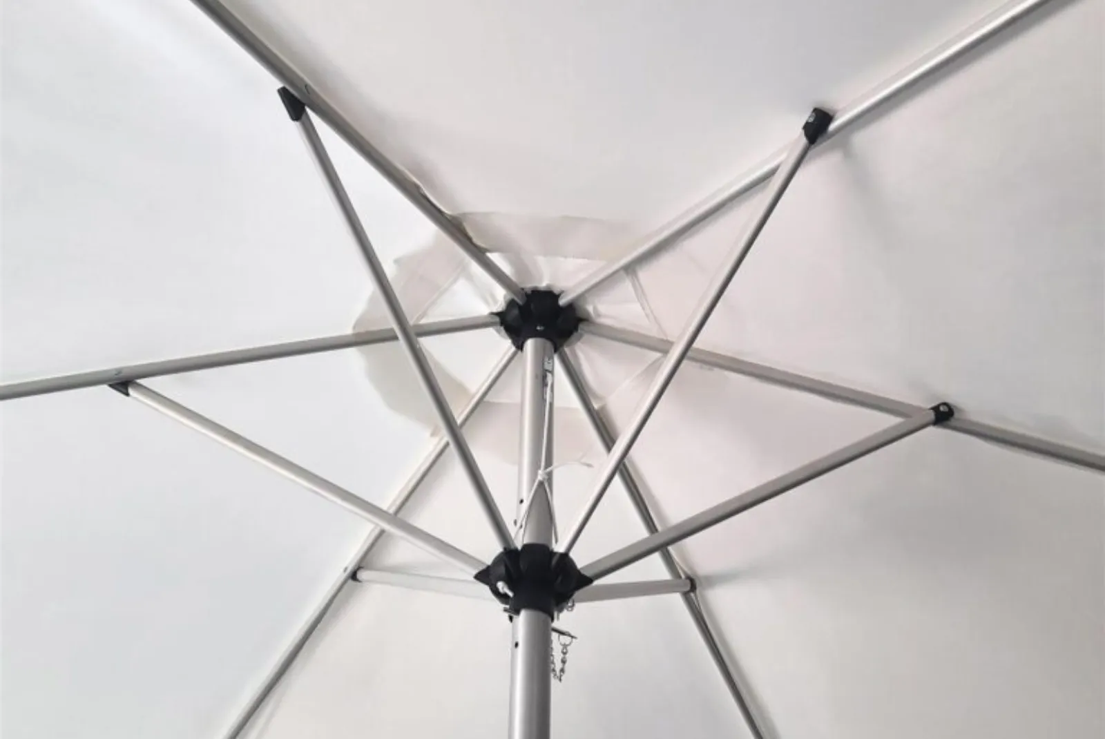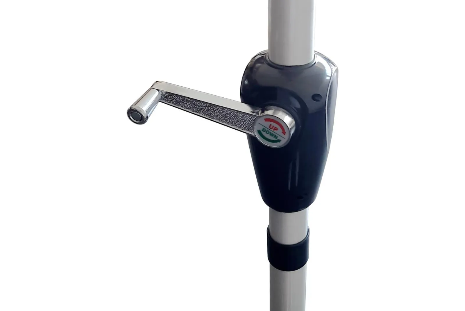 Ombrellone rotondo, l’apertura e chiusura avviene grazie al sistema di una manovella, struttura in alluminio, 6 stecche in alluminio, sez. stecche (ovali) mm 18 X 12.5, altezza fine stecca cm 208.