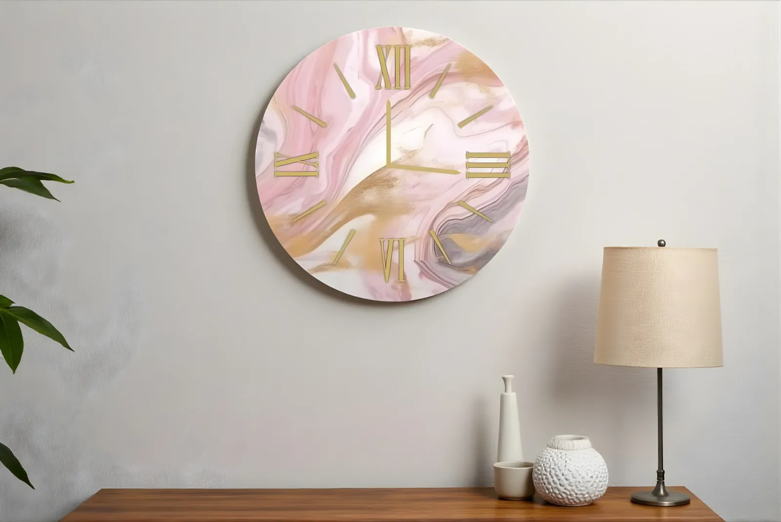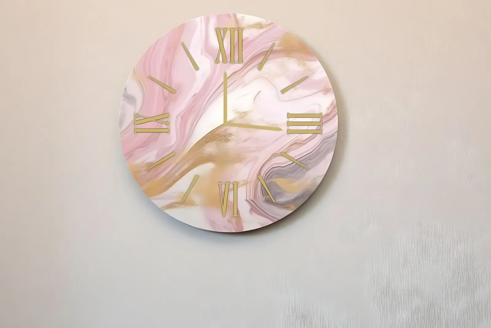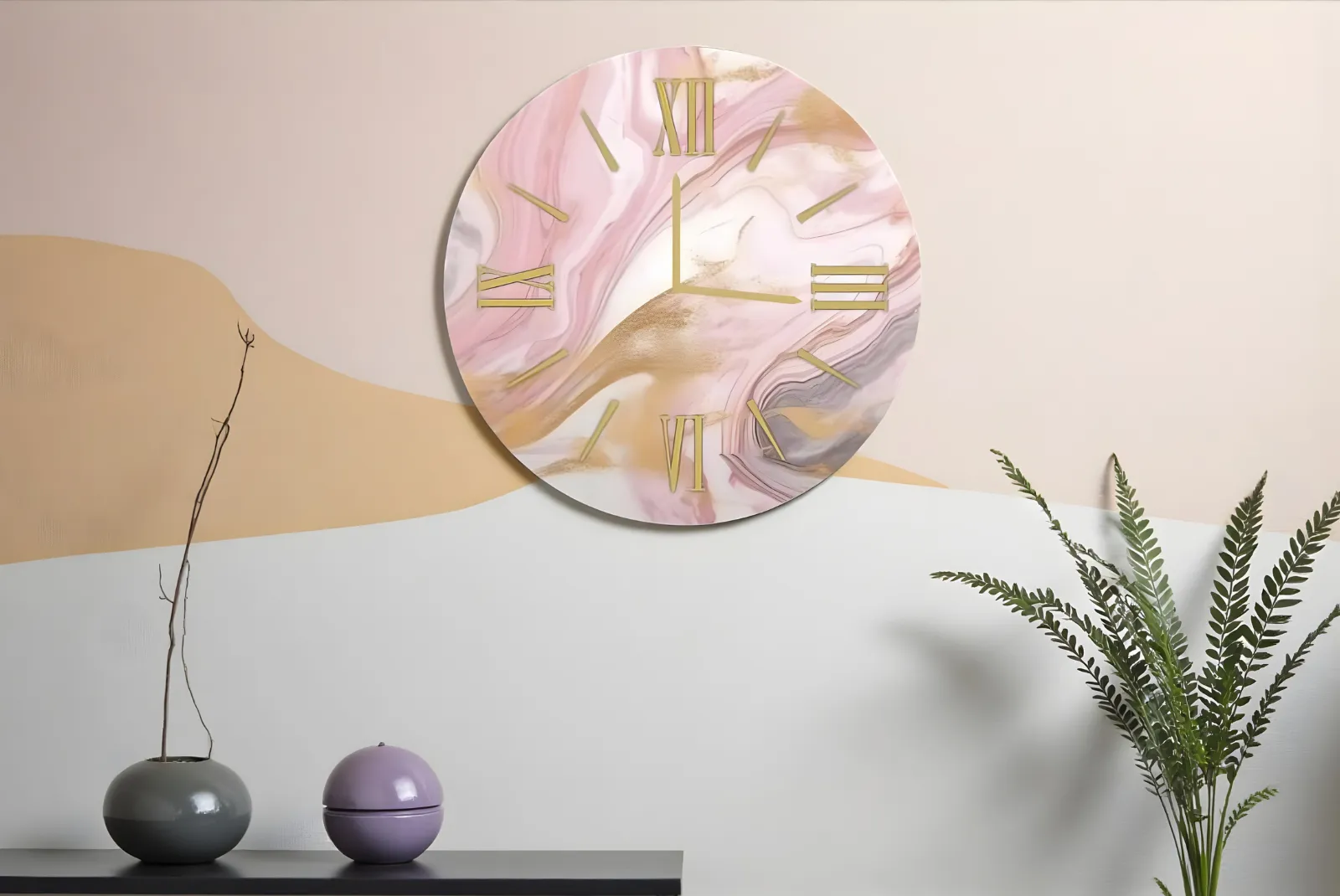 Abbellisci la tua casa con Orologio marble rosa – Stampa su vetro temperato di tendenza.