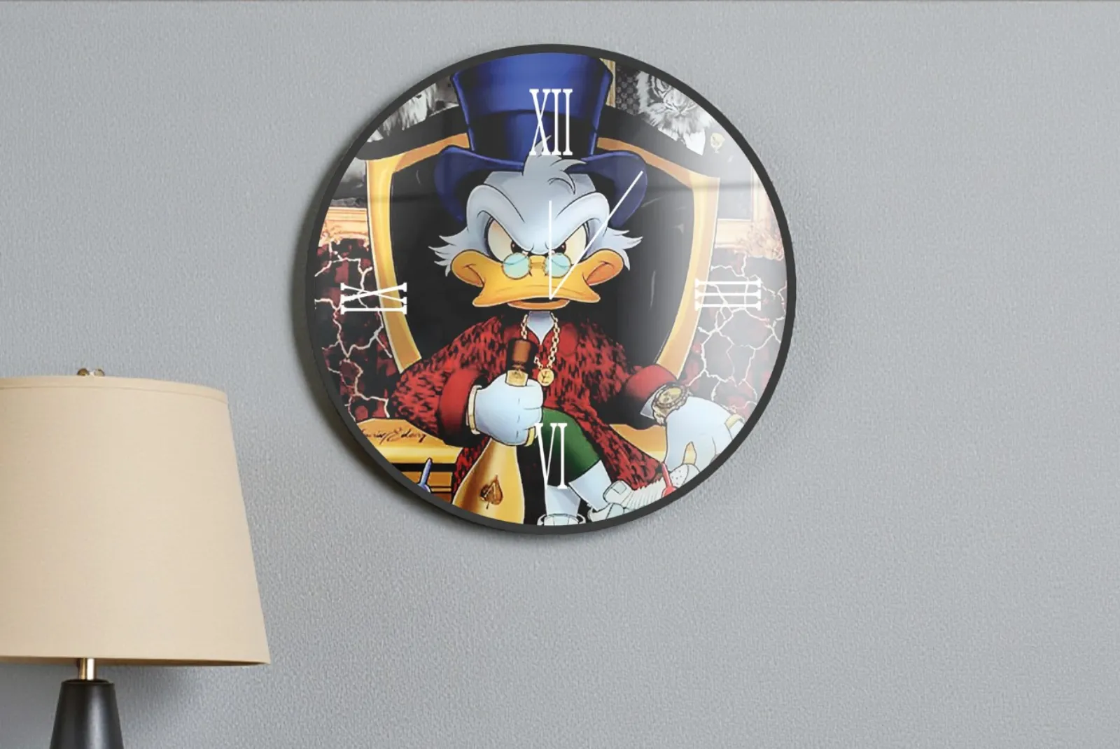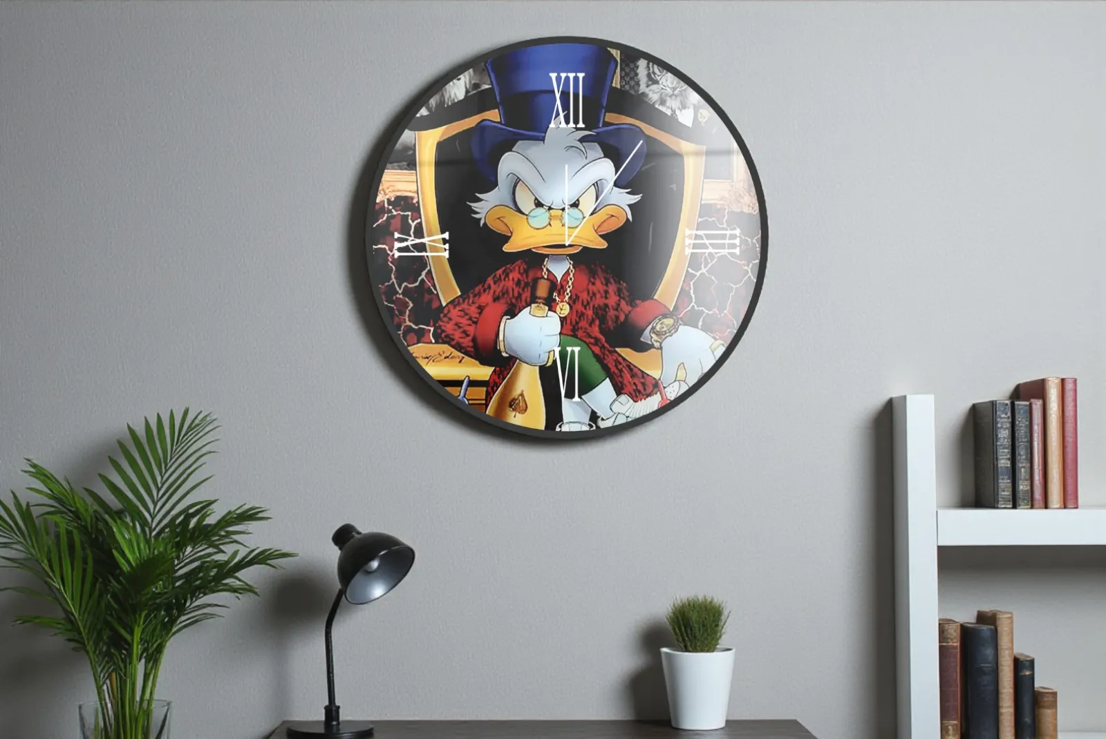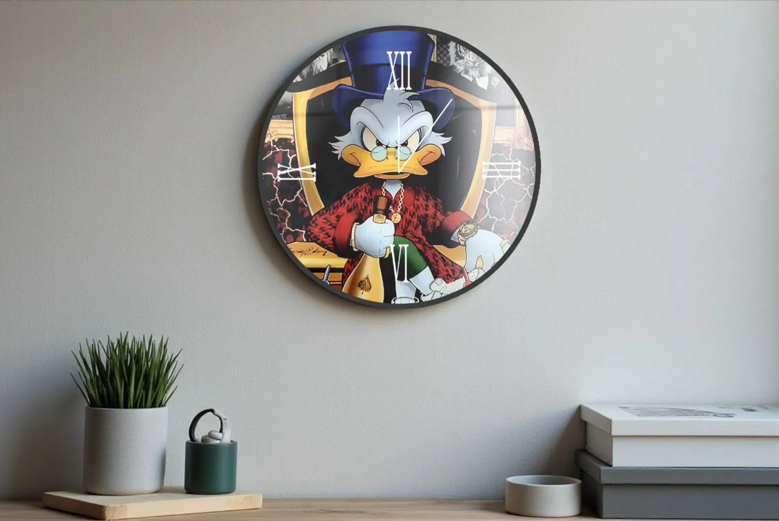 Orologio Tondo Paperone – Stampa in vetro temperato da parete perfetto per valorizzare ogni spazio della casa con un tocco elegante, moderno e originale. Realizzato con materiali di alta qualità per un tocco di classe in ogni ambiente. Design unico con stampa tridimensionale.