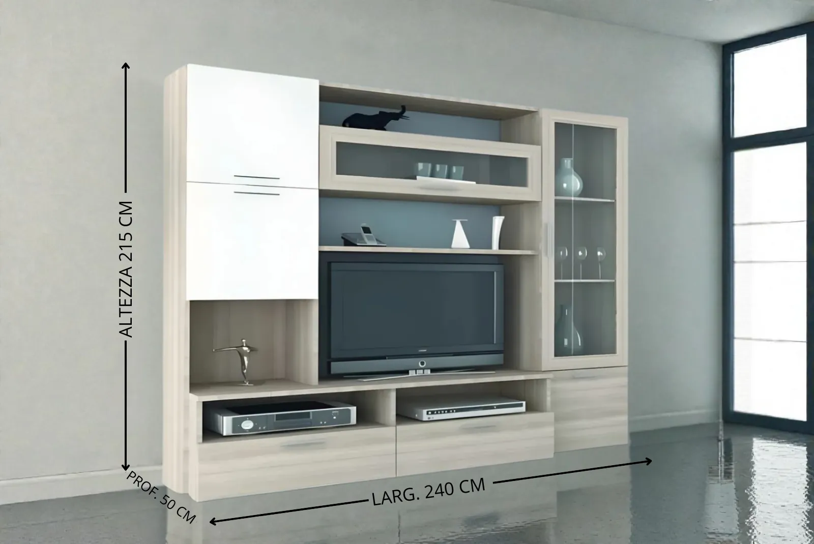 - Dimensioni Parete: Larghezza 240 – Profondità 50 – Altezza 215 cm