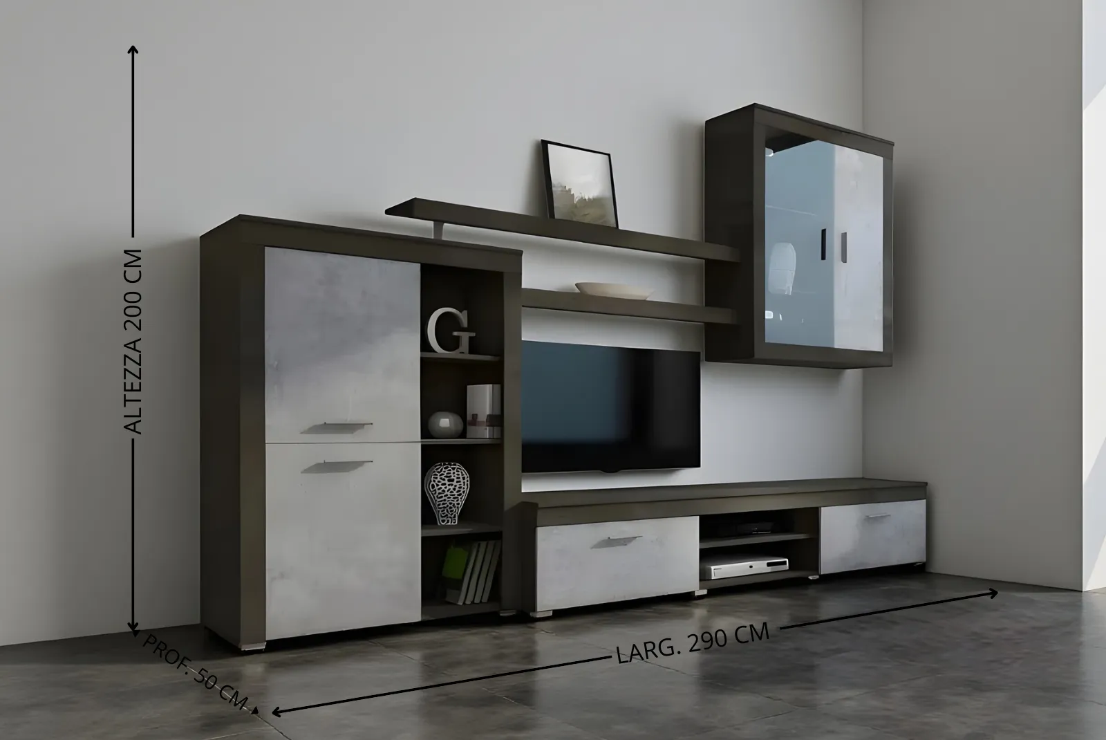 Larghezza 290 – Profondità 50 – Altezza 200 cm