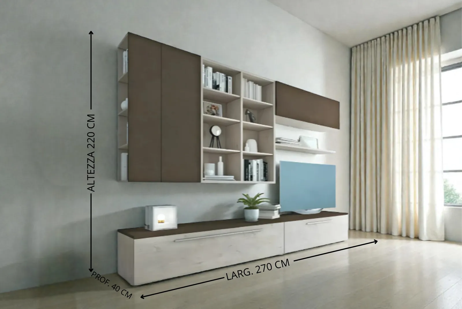- Dimensioni Parete: Larghezza 270 – Profondità 40 – Altezza 220 cm