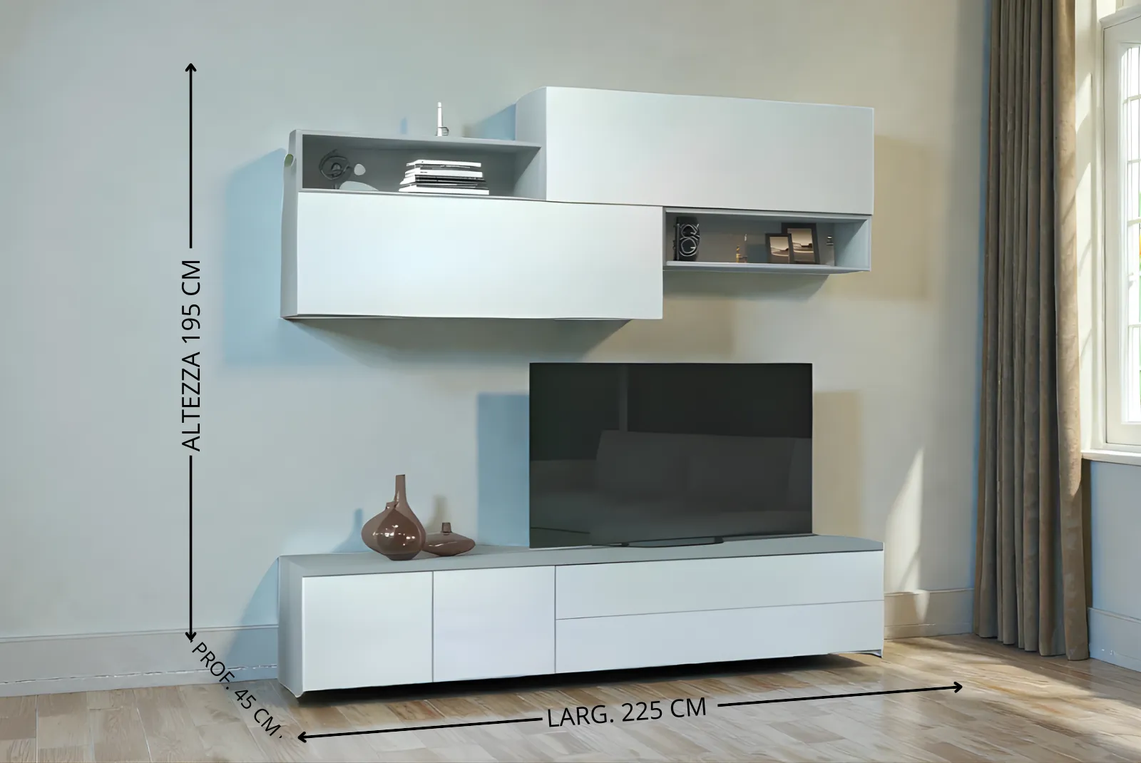 - Dimensioni Parete: Larghezza 225 – Profondità 45 – Altezza 195 cm