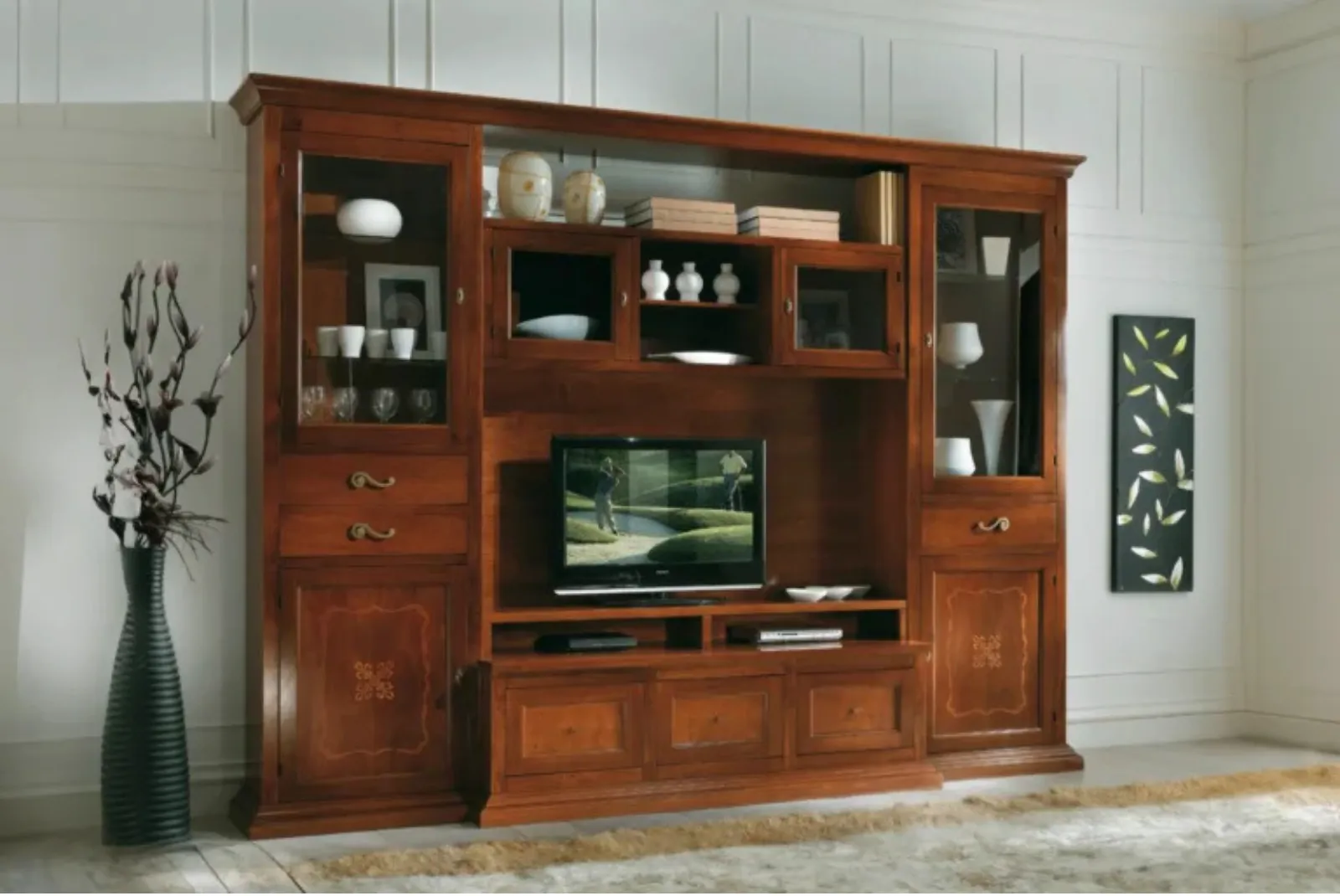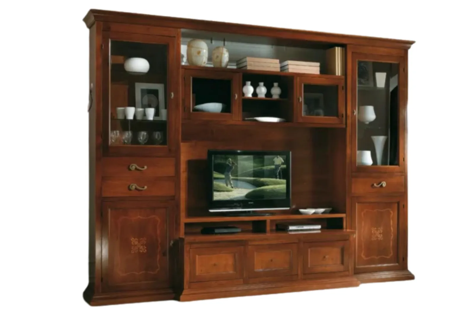 La Parete Attrezzata – Finitura Bassano con ante intarsiate è un elemento d’arredo molto versatile e funzionale, ideale per ottimizzare lo spazio in soggiorno o in altre stanze della casa. Si tratta di una struttura modulare che può includere scaffali, cassetti, mensole e spazi appositi per ospitare dispositivi elettronici come TV, stereo o console di gioco.