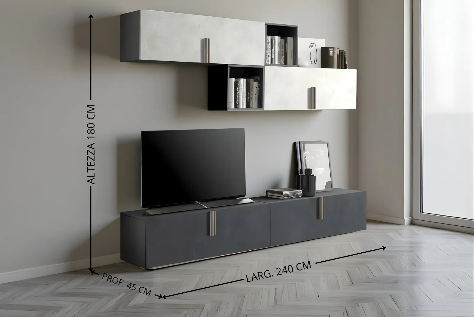 - Dimensioni: Larghezza 240 – Profondità 45 – Altezza 180 cm