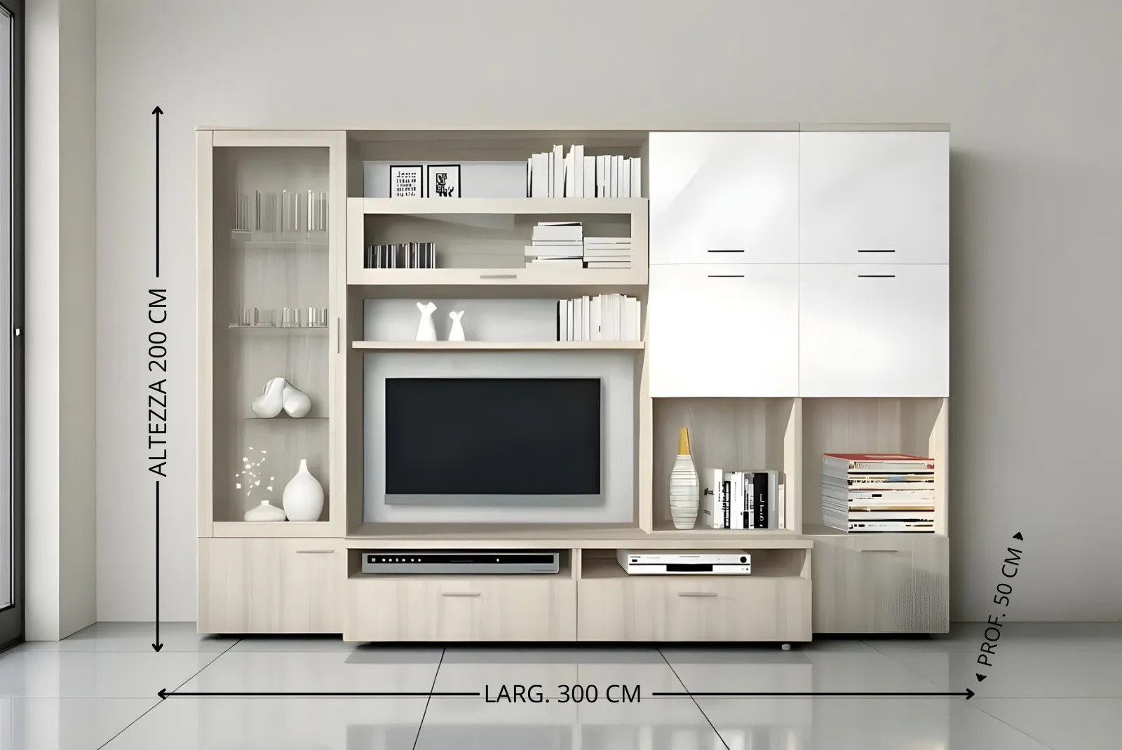 - Dimensioni Parete: Larghezza 300 – Profondità 50 – Altezza 200 cm