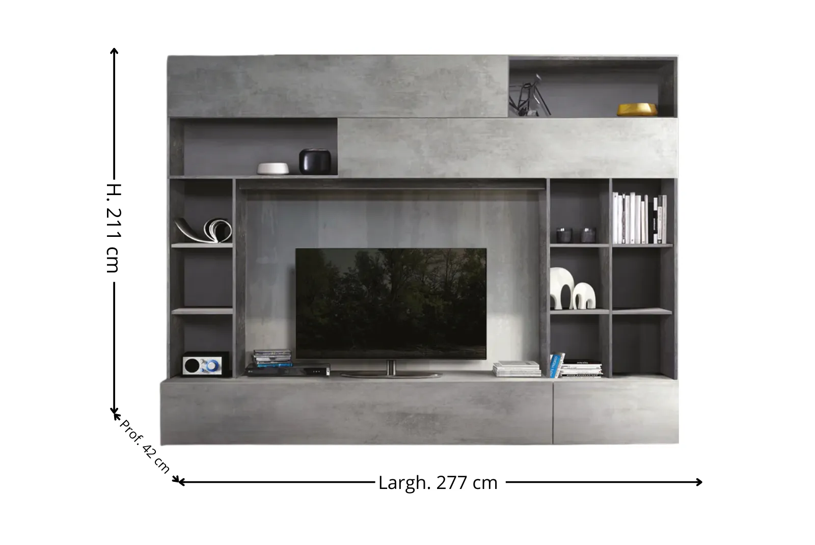 | Dimensioni Parete Attrezzata | Larghezza 277 – Profondità 42 – Altezza 211 cm |