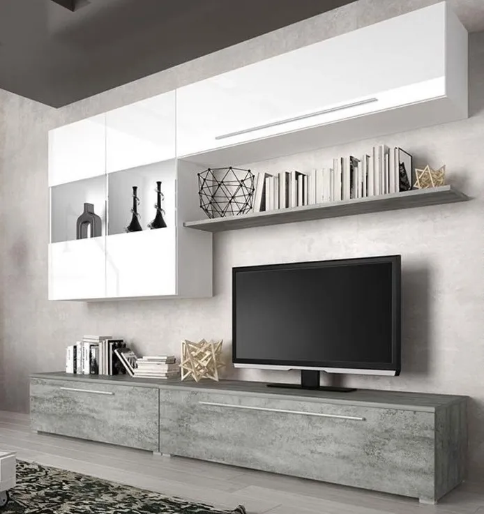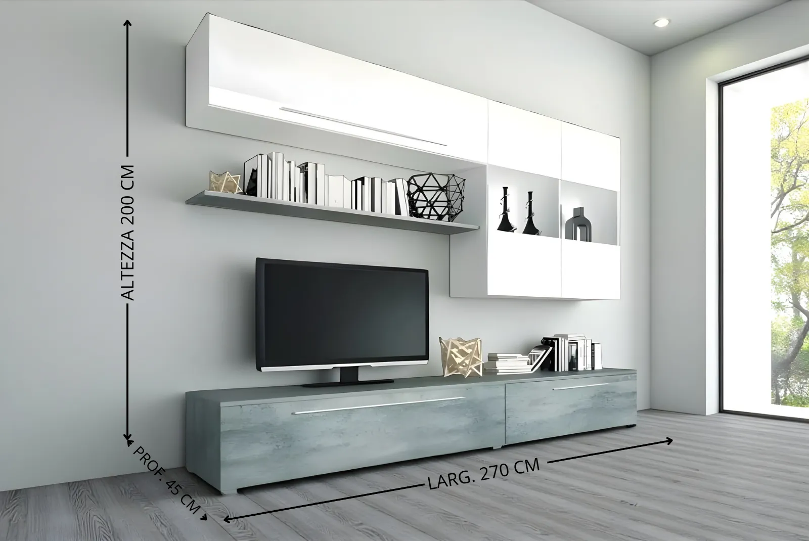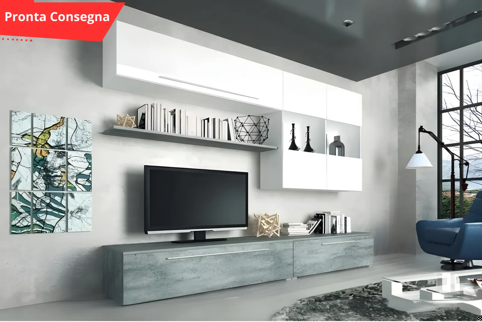 | Parete Attrezzata - Spring "Pronta Consegna" | Struttura e finitura: Bianco Lucido / Cemento |