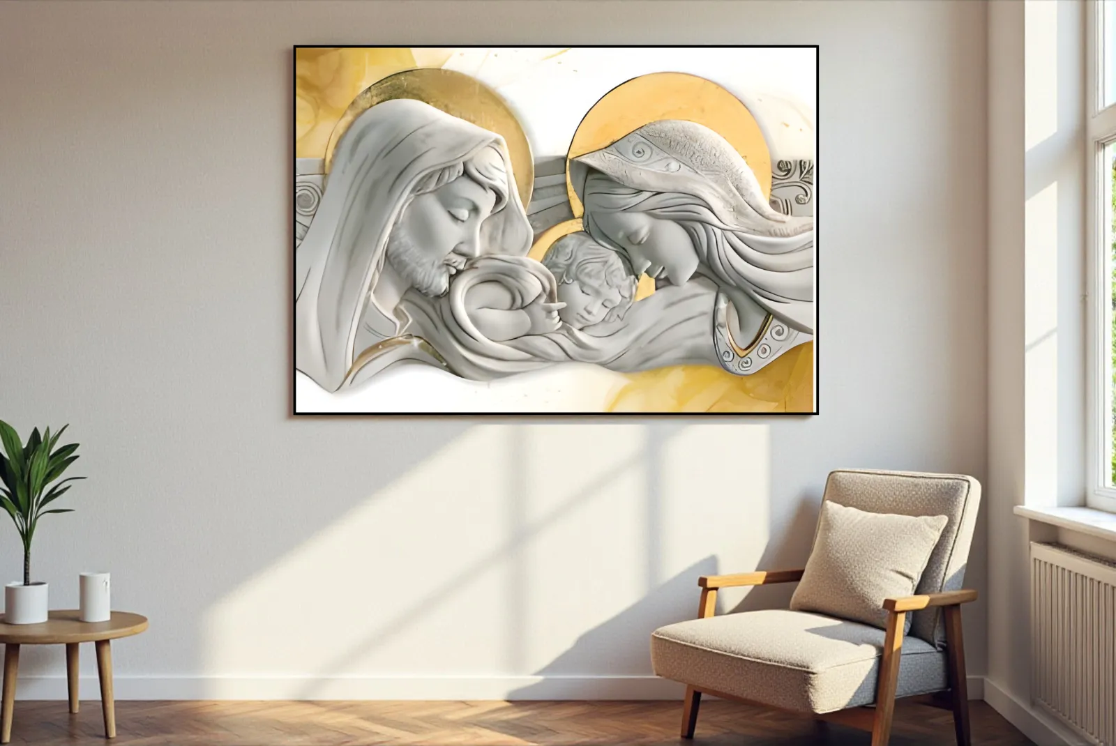 Abbellisci la tua casa con il Quadro Sacra Famiglia Gold – Stampa in vetro temperato di tendenza, questi quadri sono fatti per durare nel tempo, arredano qualsiasi ambiente , zona living , camere da letto, soggiorno, ingresso cucina, ovunque tu voglia.