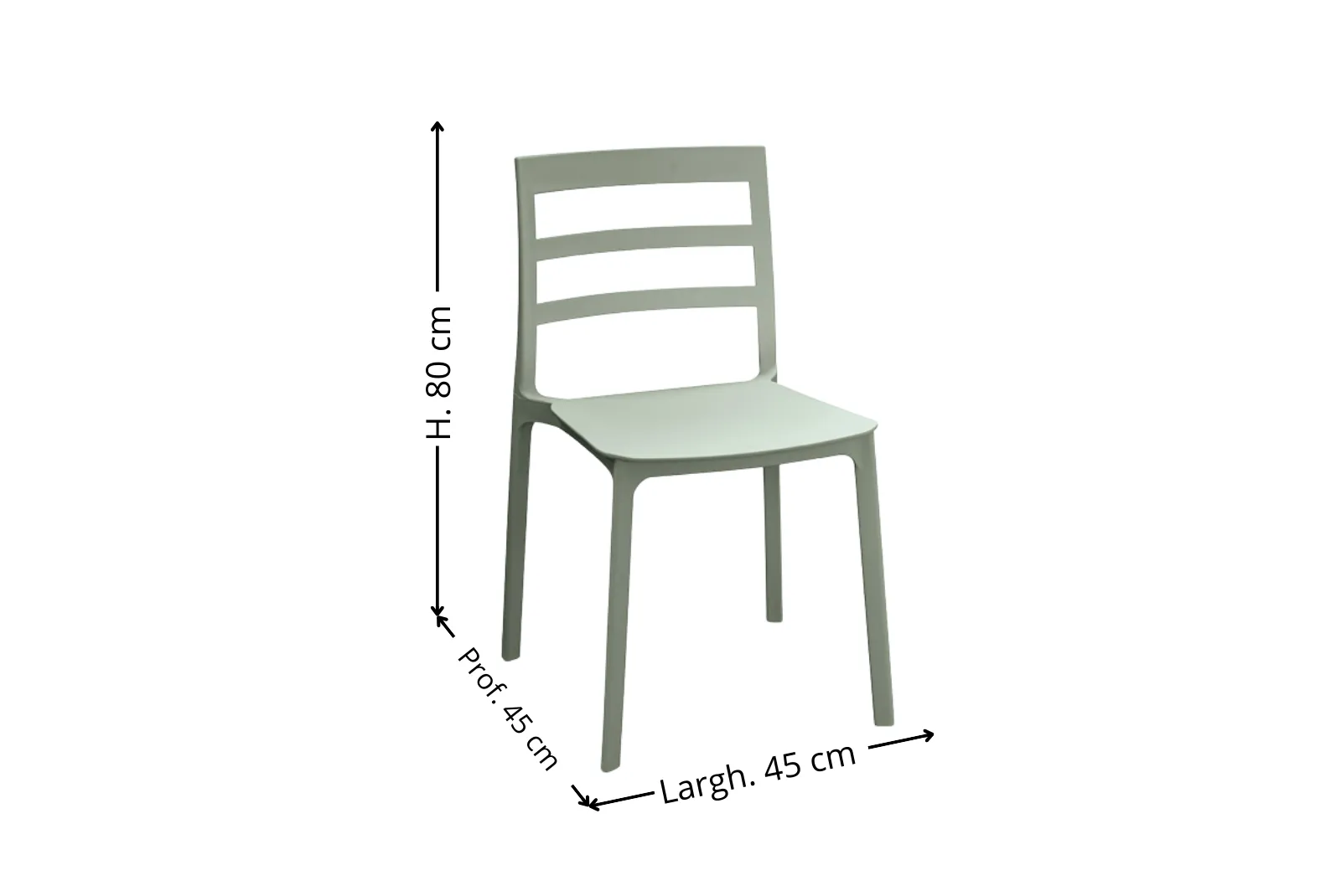 | Dimensioni Sedia | Larghezza 45 cm – Profondità 45 cm – Altezza 80 cm – Altezza sopra sedile 45 cm |