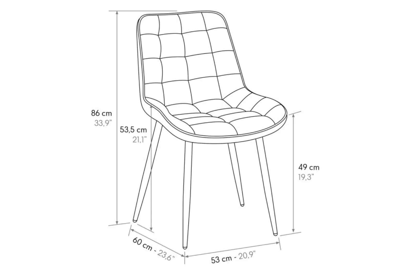 - Dimensioni: Larghezza 53 – Profondità 60 – Altezza schienale 86 – Altezza seduta 49 cm