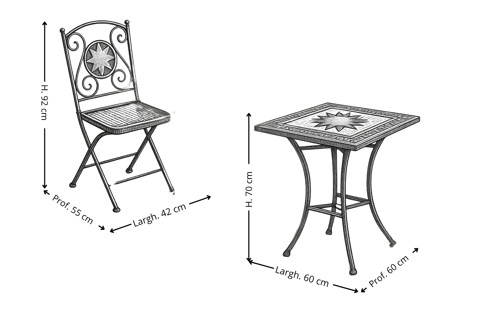 Sedie: Larghezza 42 – Profondità 55 – Altezza 92 cm Tavolino: Larghezza 60 – Profondità 60 – Altezza 70 cm