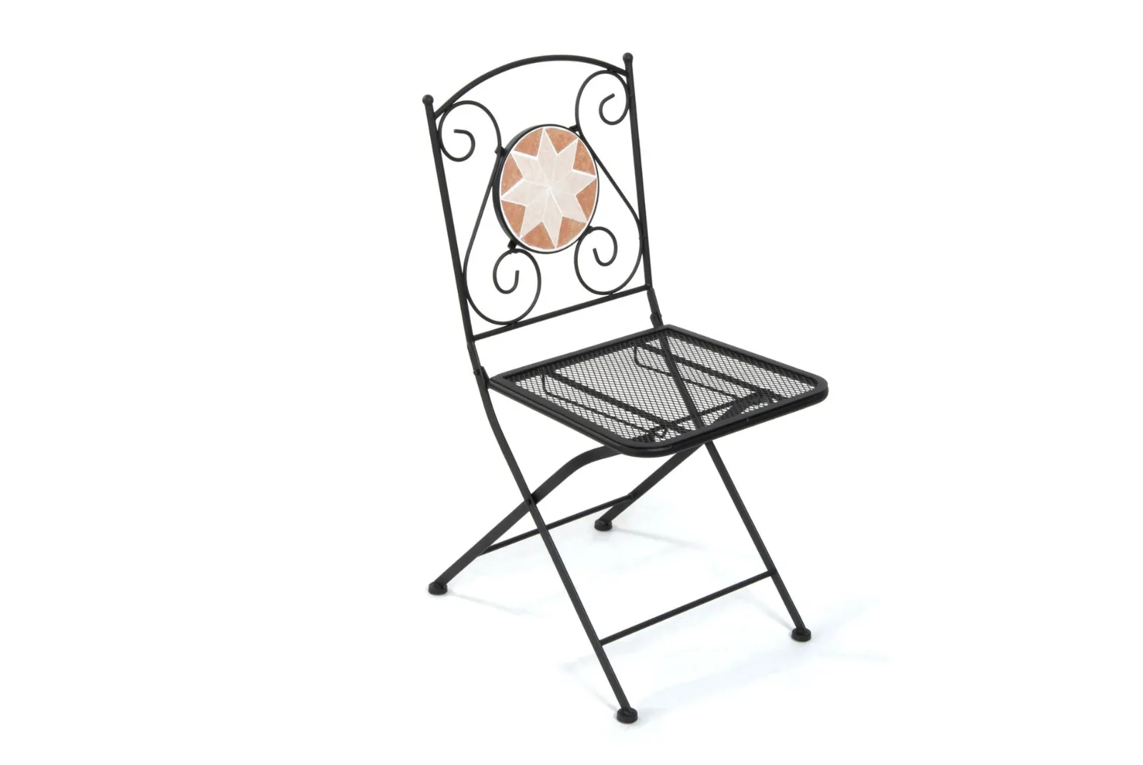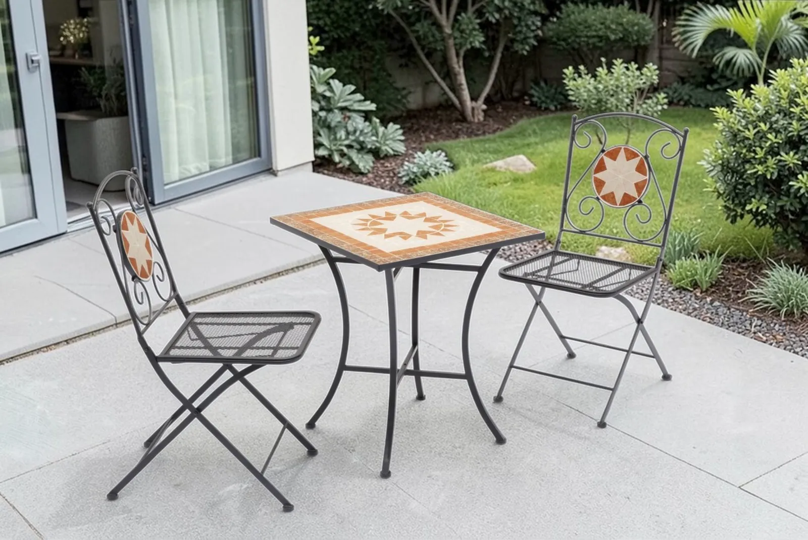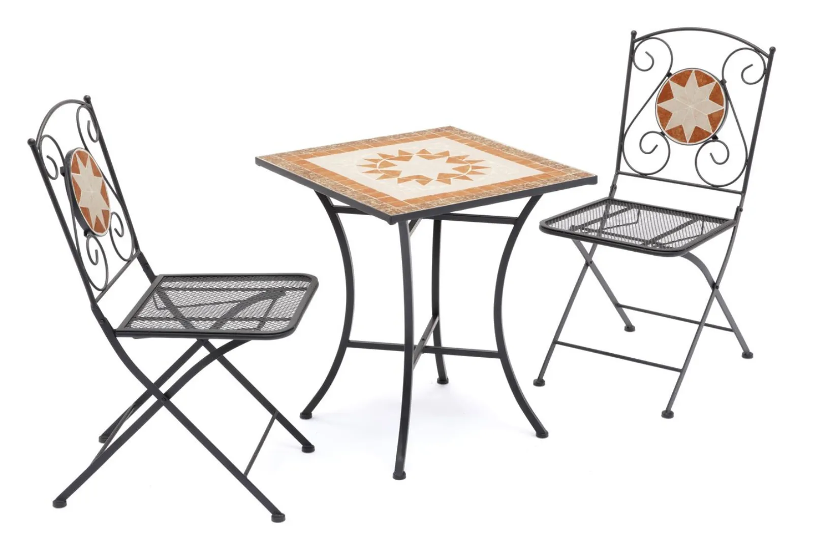 Il set è composto da un tavolino quadrato, sez. gambe mm 20 X 20 X 1.0 con piano d’appoggio a mosaico con tessere in ceramica + 2 sedie pieghevoli