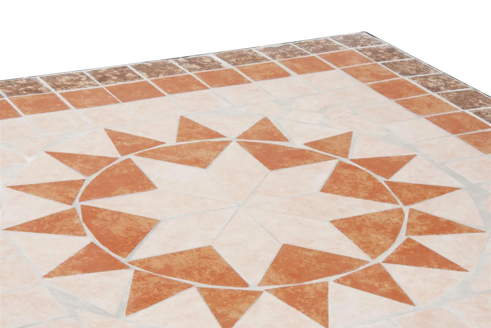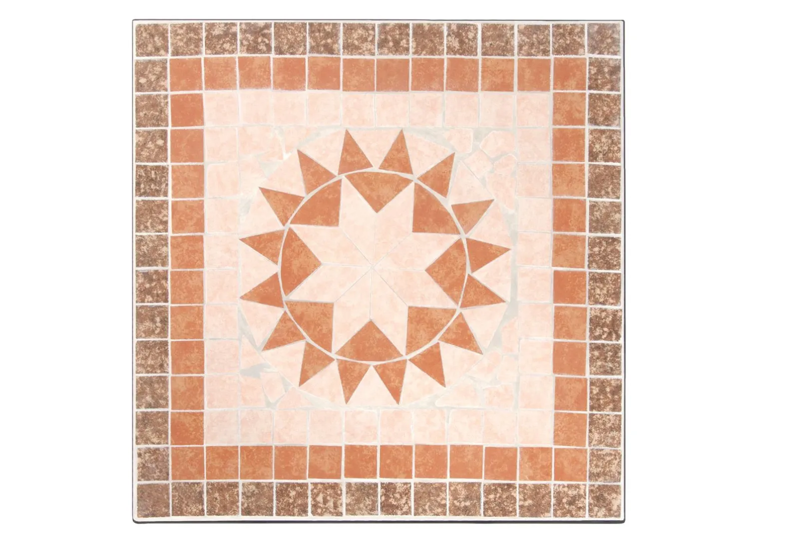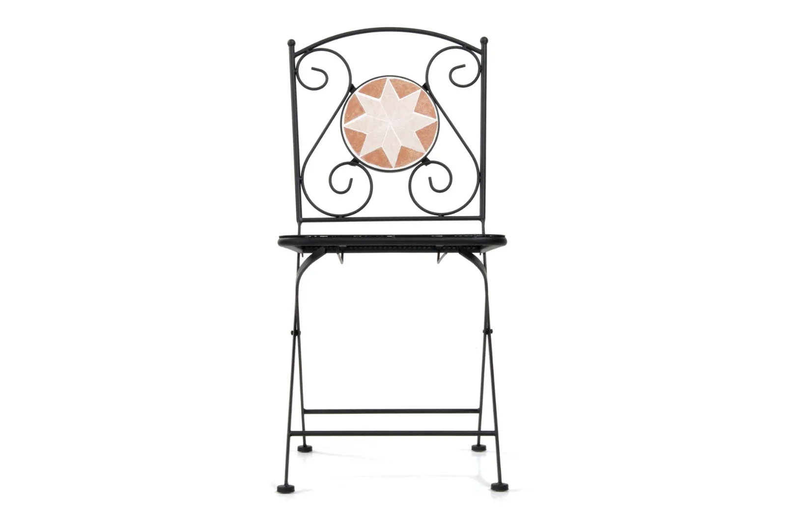 Il set è composto da un tavolino quadrato, sez. gambe mm 20 X 20 X 1.0 con piano d’appoggio a mosaico con tessere in ceramica + 2 sedie pieghevoli