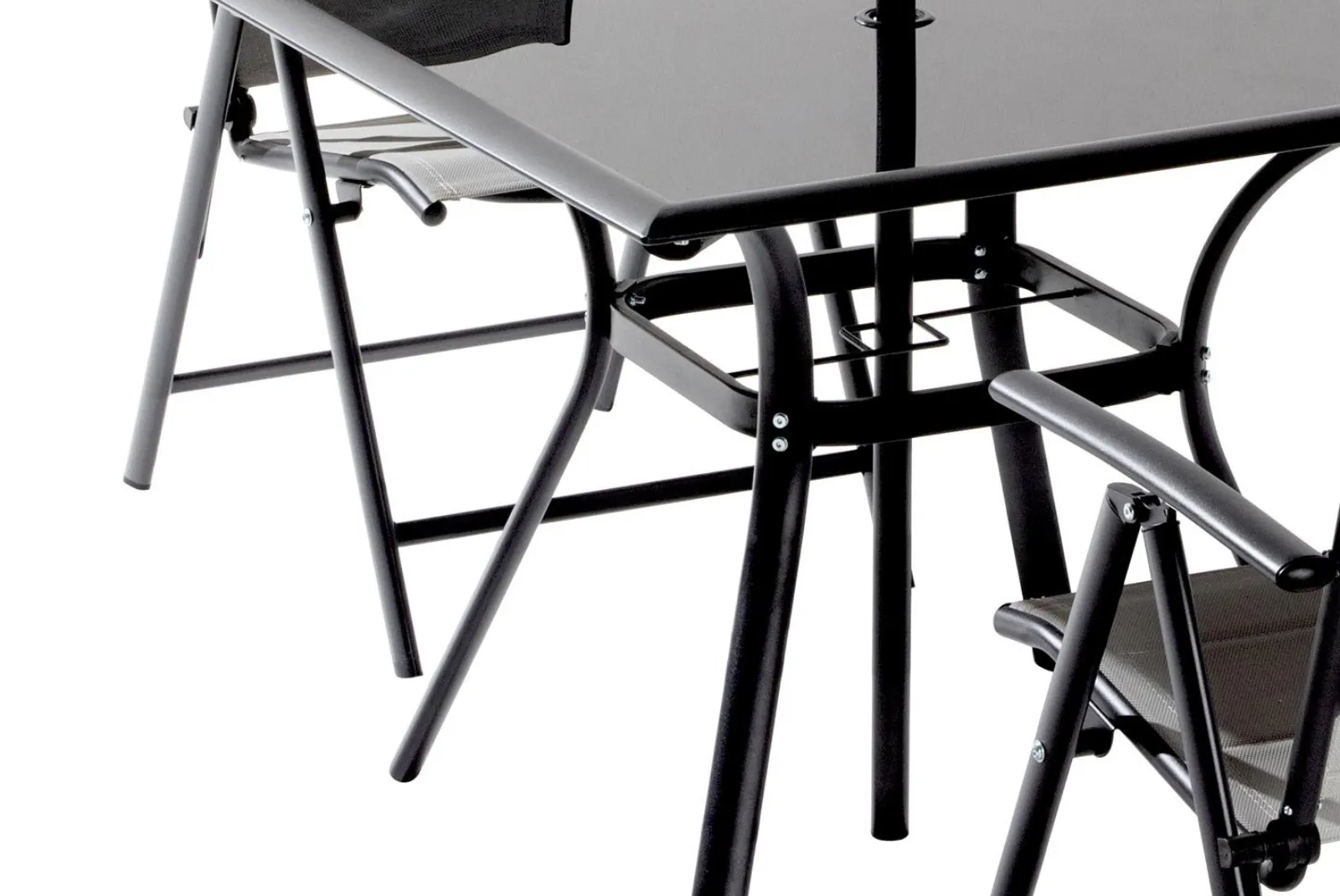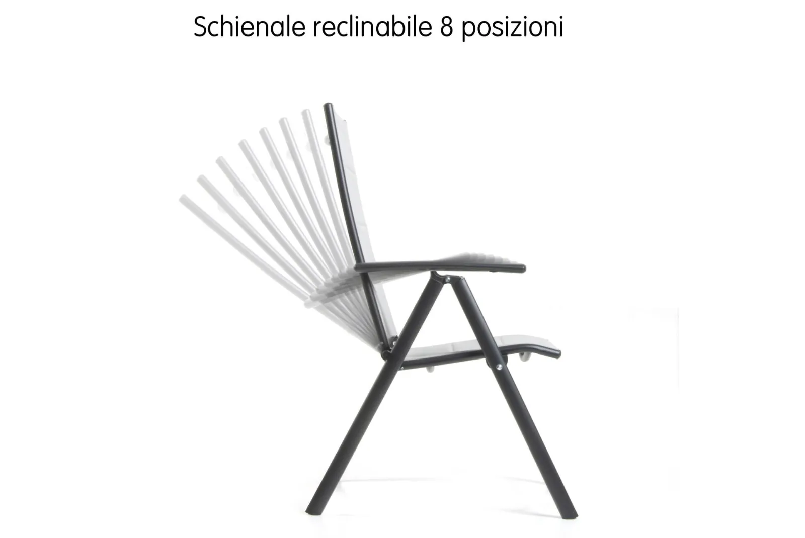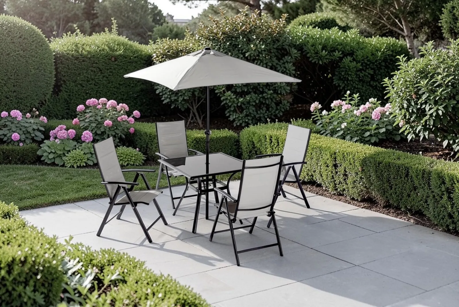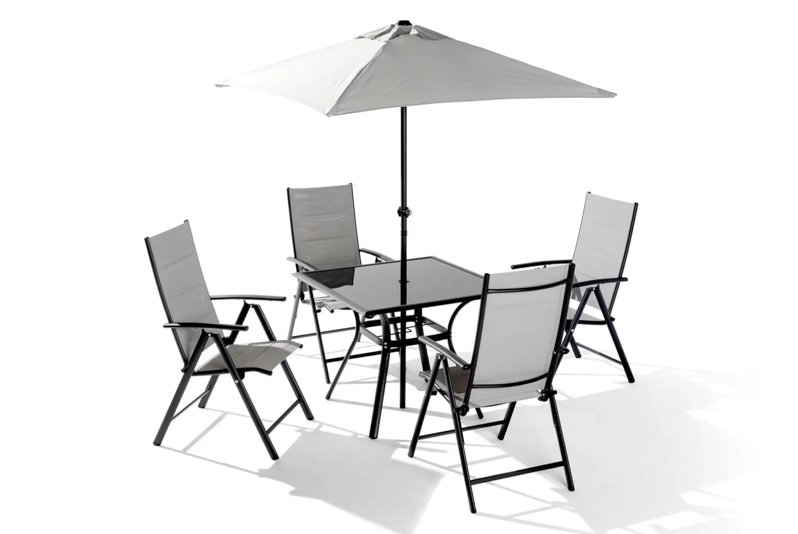 Il set è composto da 4 sedie pieghevoli con schienale reclinabile, 8 posizioni con braccioli + tavolo piano in vetro temperato + ombrellone con manovella (Base non inclusa).