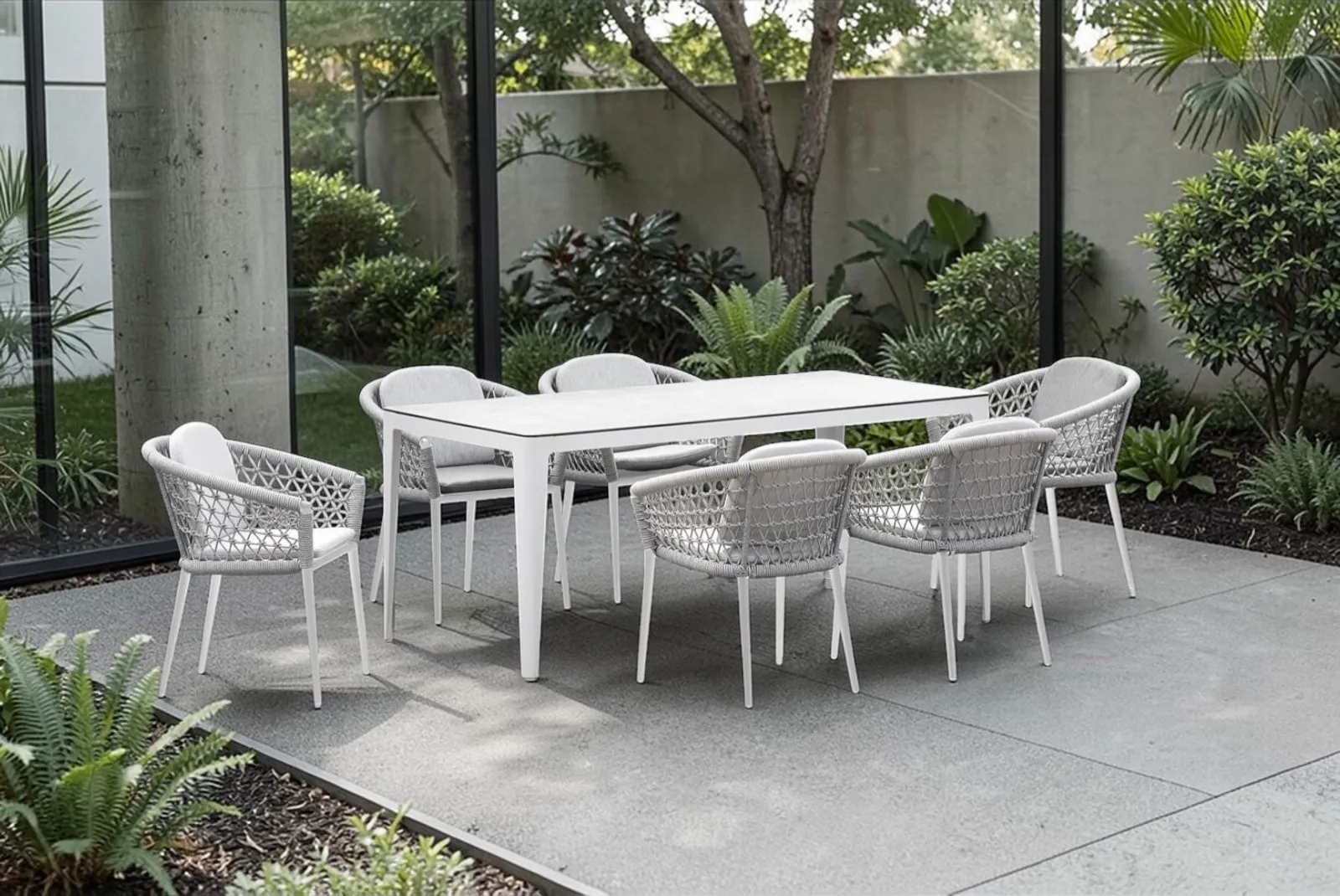 Il Set tavolo + 6 sedie Venus 180 è la soluzione perfetta per chi cerca eleganza e funzionalità in un ambiente compatto. Progettato con attenzione ai dettagli, questo set offre un design moderno e accattivante che si adatta perfettamente a qualsiasi spazio abitativo, sia interno che esterno.