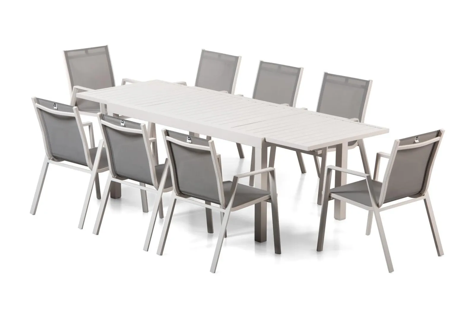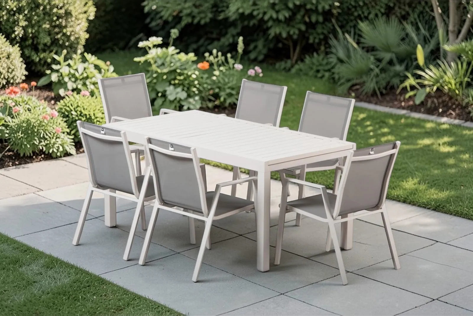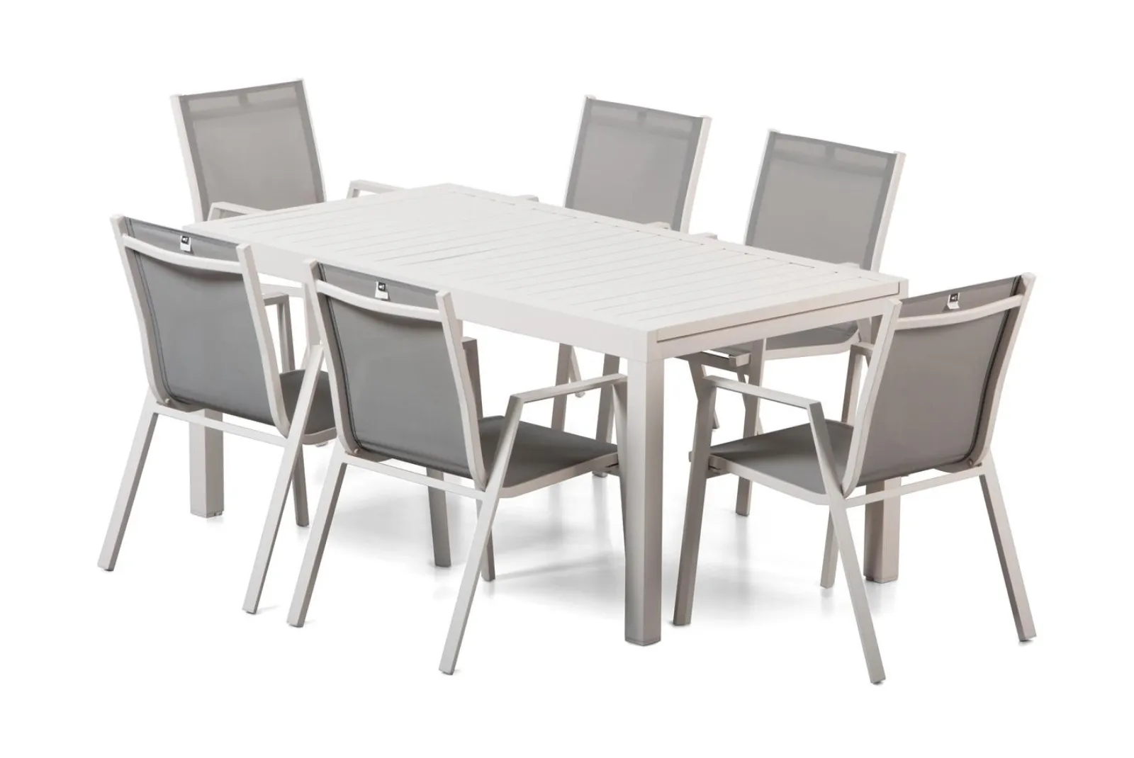 Il Set è composto da un tavolo rettangolare estensibile tubo di sostegno mm 25 X 25, gambe mm 60 X 60, piano d’appoggio a doghe in alluminio + 6 sedie con braccioli gambe mm 40 X 20, sezione tubolari tessuto seduta mm 25 X 25, sezione tubolari tessuto schienale mm 20 X 20.