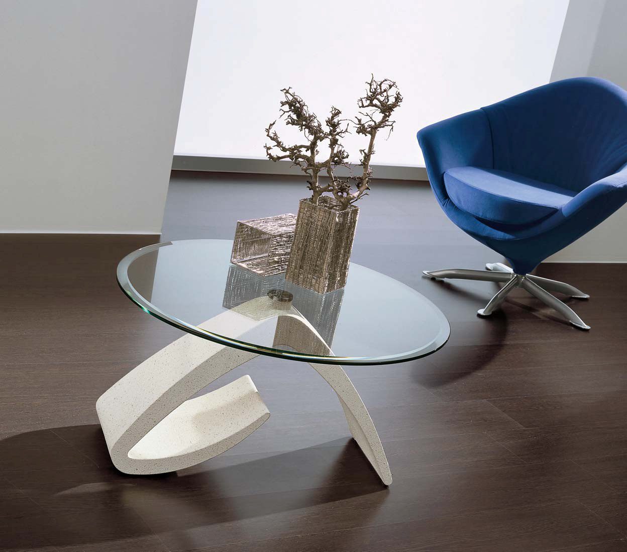 Tavolino con base in marmo sintetico sovraverniciato bianco e piano in vetro con uno spessore di 10 mm sostenuto da apposite placche in acciaio saldate al vetro con colla UV.