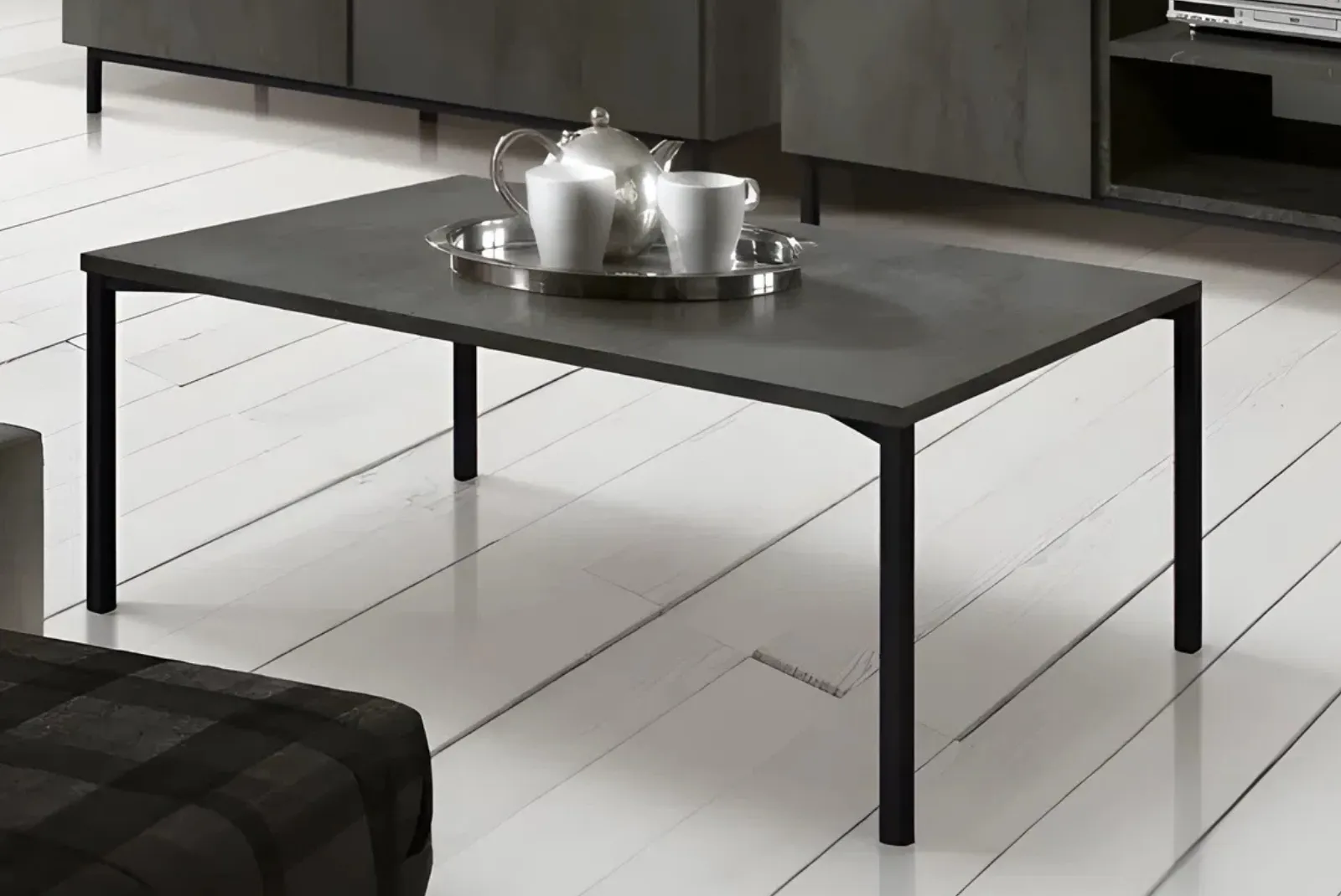 Arreda il tuo soggiorno con stile e funzionalità con questo Tavolino rettangolare struttura in metallo piano in laminato colore acciaio ossidato da salotto dal design industriale e raffinato.