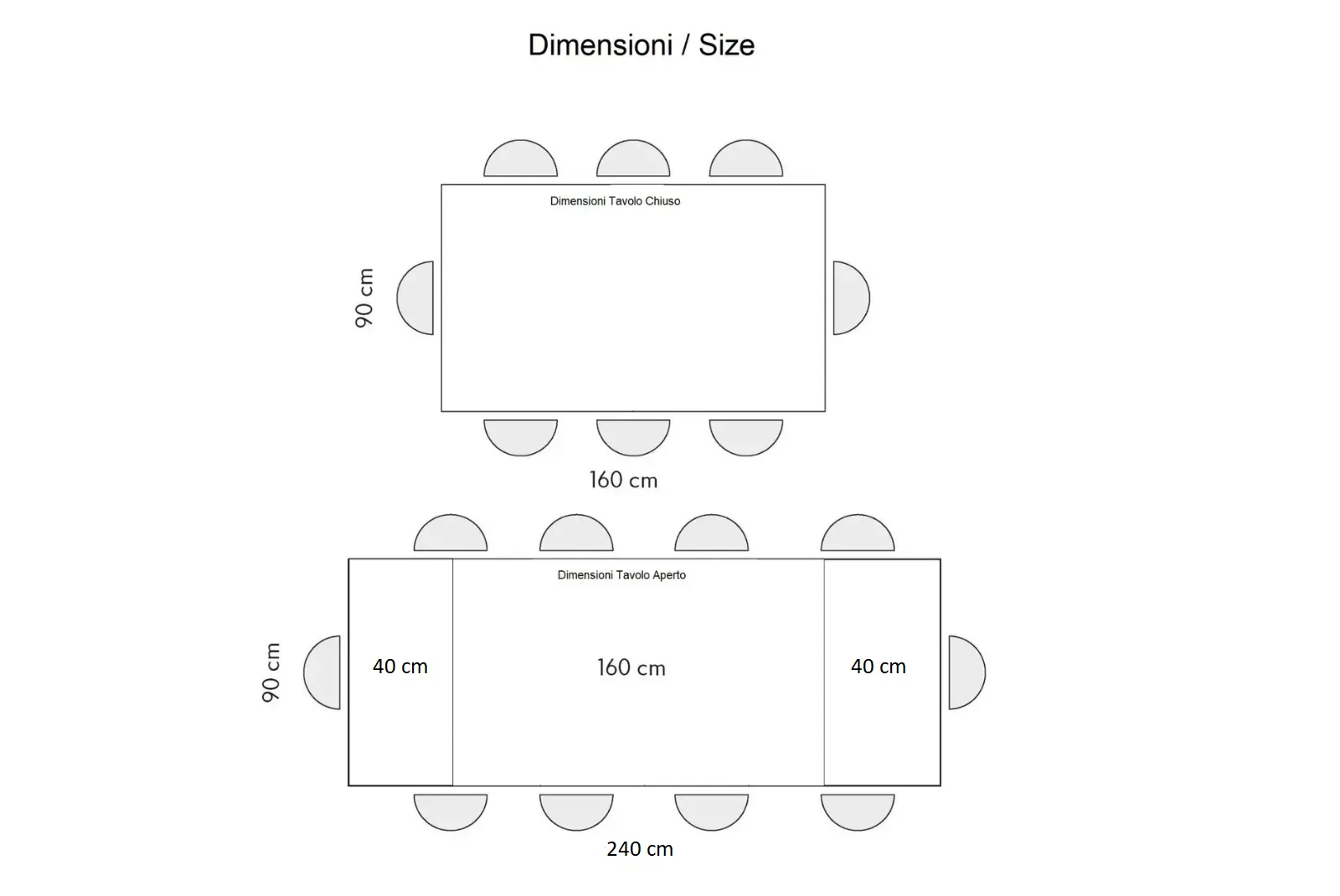 - Dimensioni chiuso: Lunghezza 160 cm (estendibile) – Profondità 90 cm – Altezza 75 cm