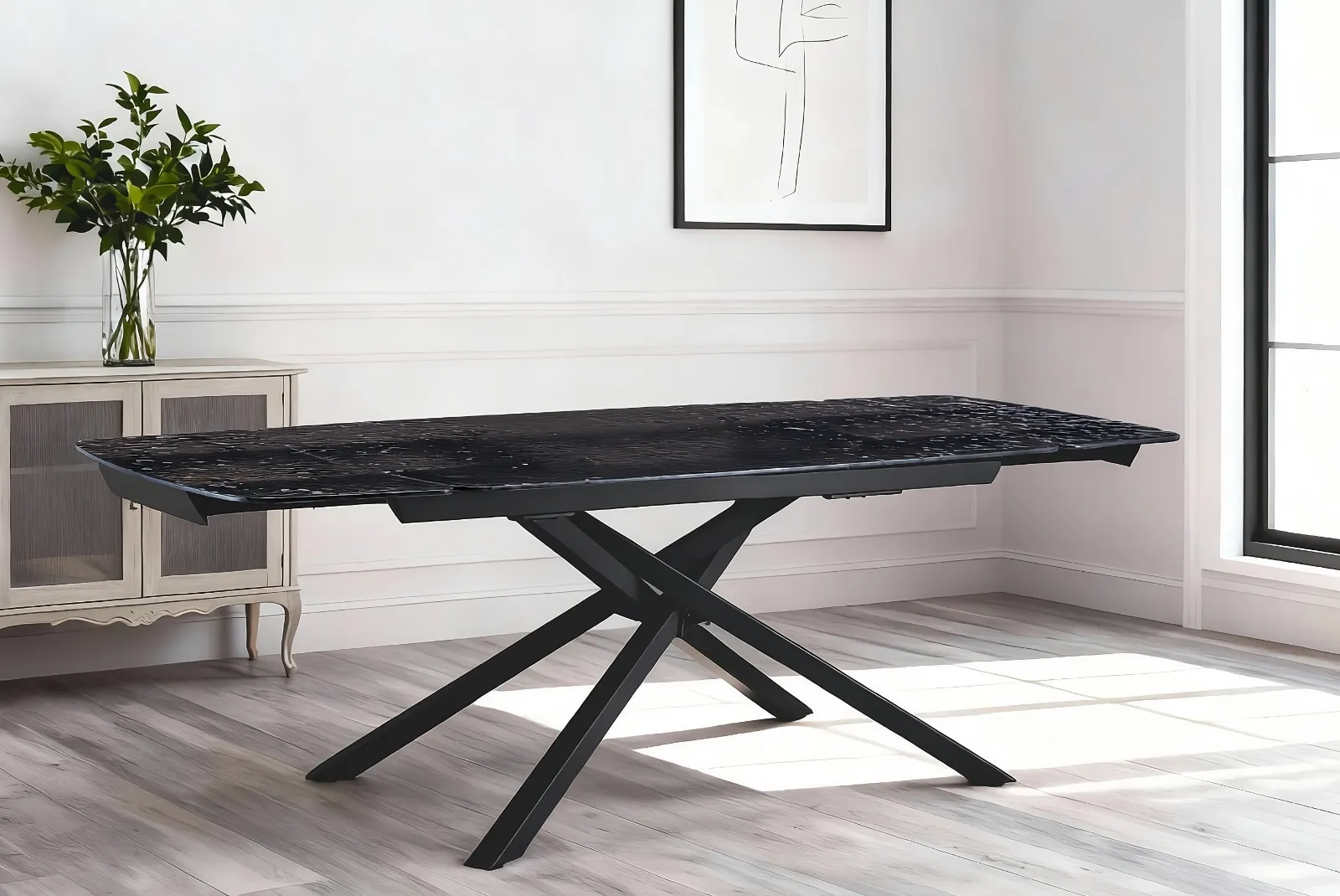 La struttura verniciata nero dona un tocco di raffinatezza, rendendolo facilmente abbinabile a diversi stili di arredamento, mentre il piano in vetro martellato aggiunge un elemento di lusso e resistenza, garantendo una superficie durevole e facile da pulire.