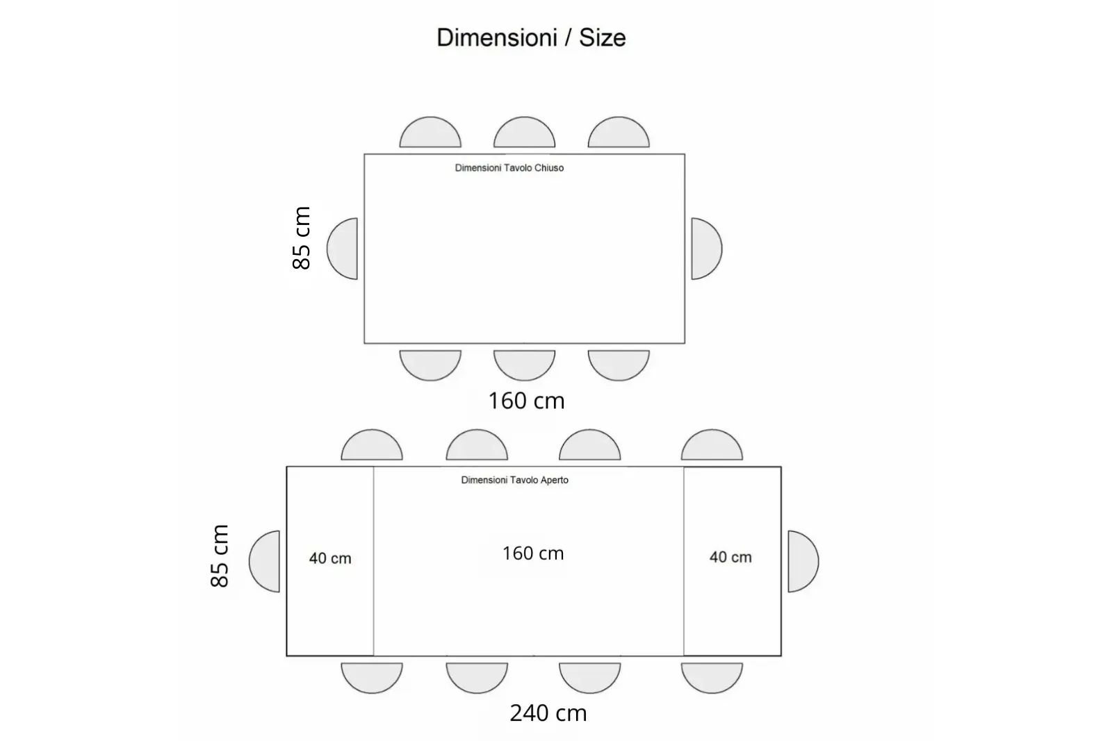 • Dimensioni aperto: Larghezza 240 – Profondità 85 – Altezza 80 cm