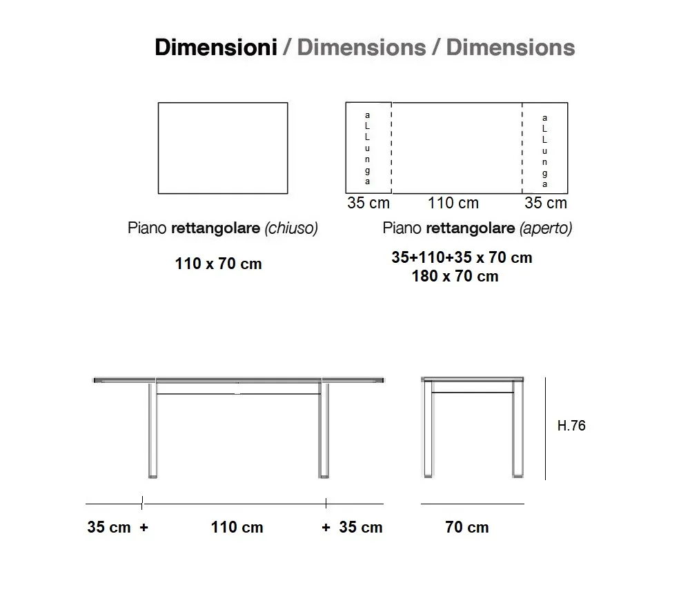 - Estensione: 2 allunghe laterali da cm. 35 – le allunghe alloggiano nel piano tavolo