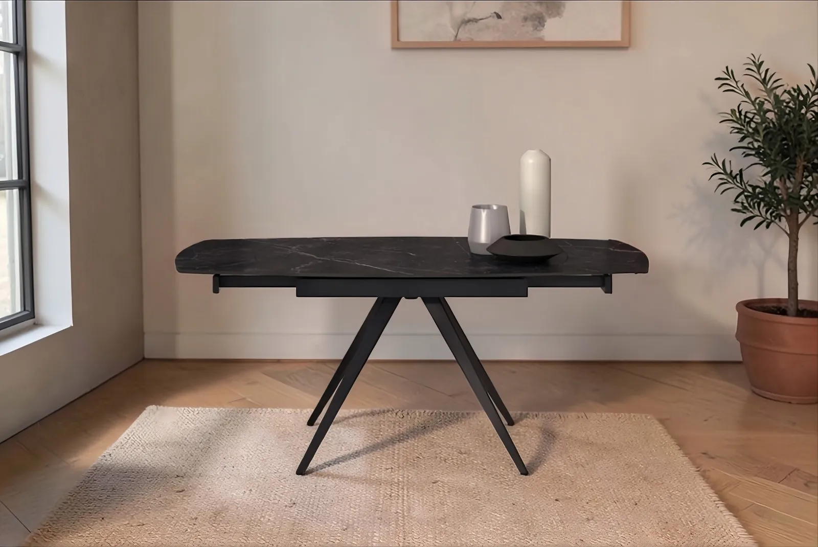 La base in metallo colore nero robusta e stabile, mentre il piano in ceramica arrotondato dal suggestivo colore marmo nero elegante e resistente all’usura. Adatto a tutti gli stili e ambienti della tua casa.