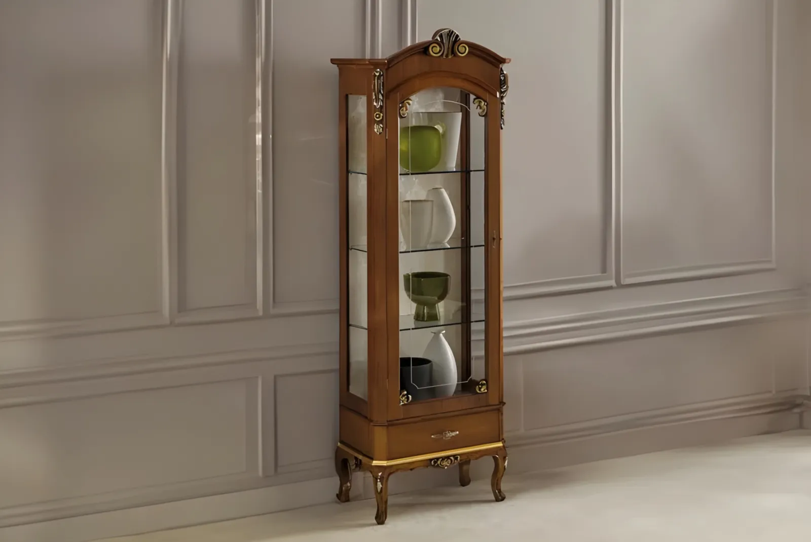 Realizzata a mano con maestria, questa Vetrina 1 porta – Finitura noce incarna la bellezza autentica e la semplicità della natura. Le venature uniche del legno, lavorate con finitura Noce, creano un pezzo unico e pieno di carattere.