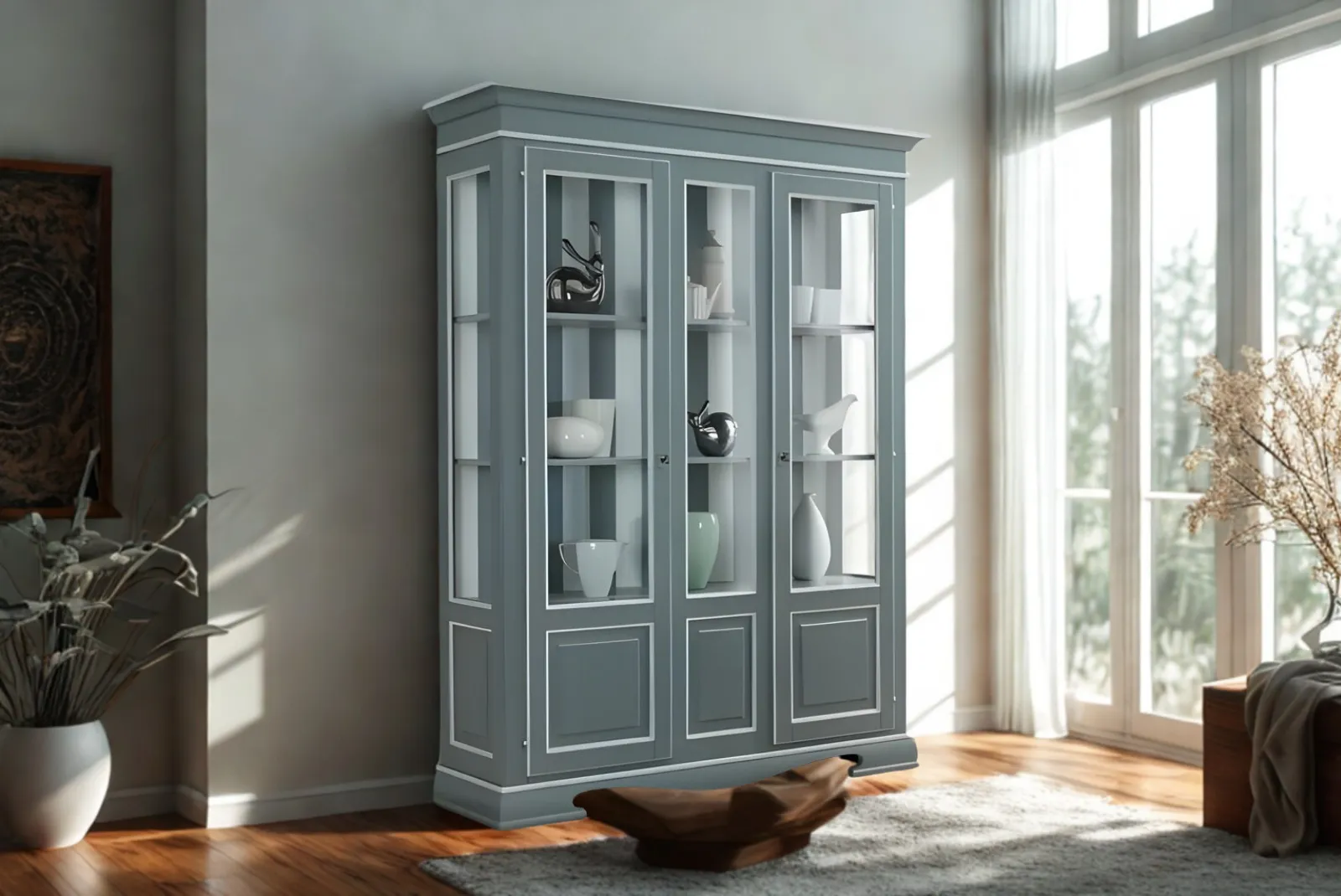 Realizzata a mano con maestria, questa Vetrina 3 ante con Finitura Grigio Laccati incarna la bellezza autentica e la semplicità della natura. Le venature uniche del legno, lavorate con finitura grigio laccato con profili di colore bianco, creano un pezzo unico e pieno di carattere.